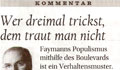 Peter Rabl beschreibt in seinem Kommentar im KURIER am 16. Nov. 2008 bestens weshalb man auch meines Erachtens Werner Faymann nicht trauen kann. Er wird immer wieder zu populistischen Aussagen (für ihn typisch: die Leut geschickt für dumm zu verkaufen) greifen anstatt Probleme echt zu lösen. Lesen Sie hier: