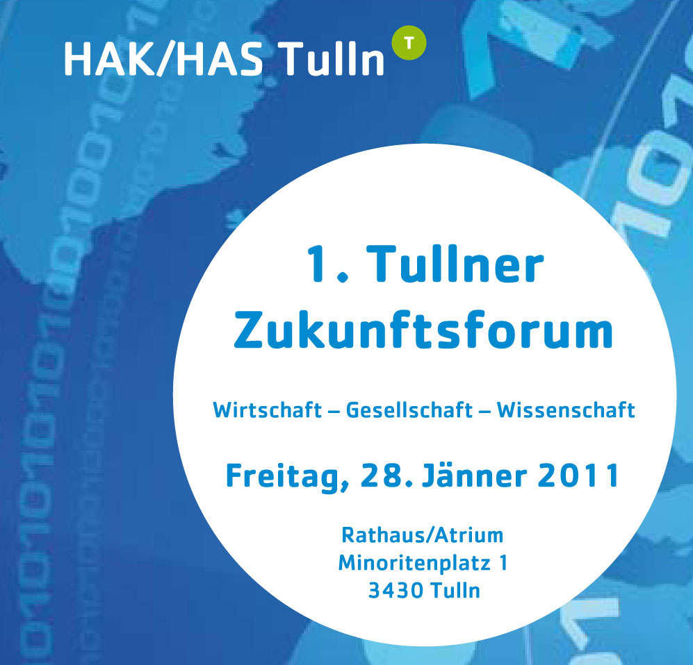Gemeinsam über den Tellerrand schauen, gesamtgesellschaftliche Bezüge herstellen und soziale Verantwortung diskutieren: Das können die TeilnehmerInnen des 1. Tullner Zukunftsforums am Freitag, 28. Jänner 2011, einen ganzen Tag lang in der Bezirkshauptstadt. Bei der von der HAK/HAS Tulln in Kooperation mit der Stadtgemeinde als Schulerhalter organisierten Veranstaltung bietet sich der breiten Öffentlichkeit die einmalige Gelegenheit, mit besonders renommierten Persönlichkeiten aus Wirtschaft, Gesellschaft und Wissenschaft gesellschaftliche Entwicklungen und Veränderungen aus verschiedenen Perspektiven zu betrachten und sich mit der Zukunft unseres Landes und der Welt auseinanderzusetzen.