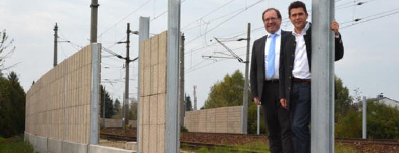 Erste Etappe des Bahn-Lärmschutzes im Langenlebarnerviertel kurz vor der Fertigstellung